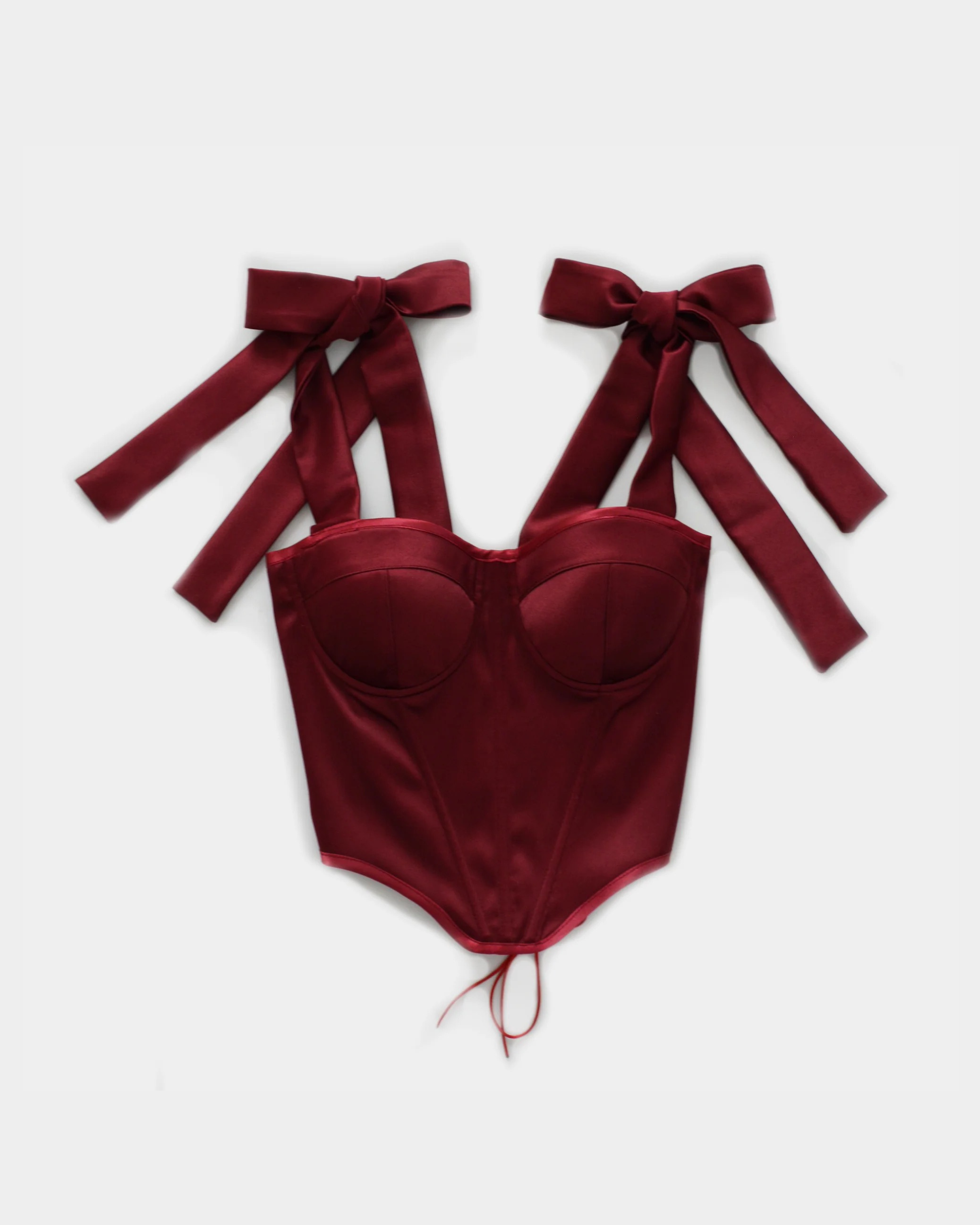 BurgundyEmbrace sustainable fashion with our beautifully crafted corset with bow straps, a true embodiment of style, quality, and conscience.
