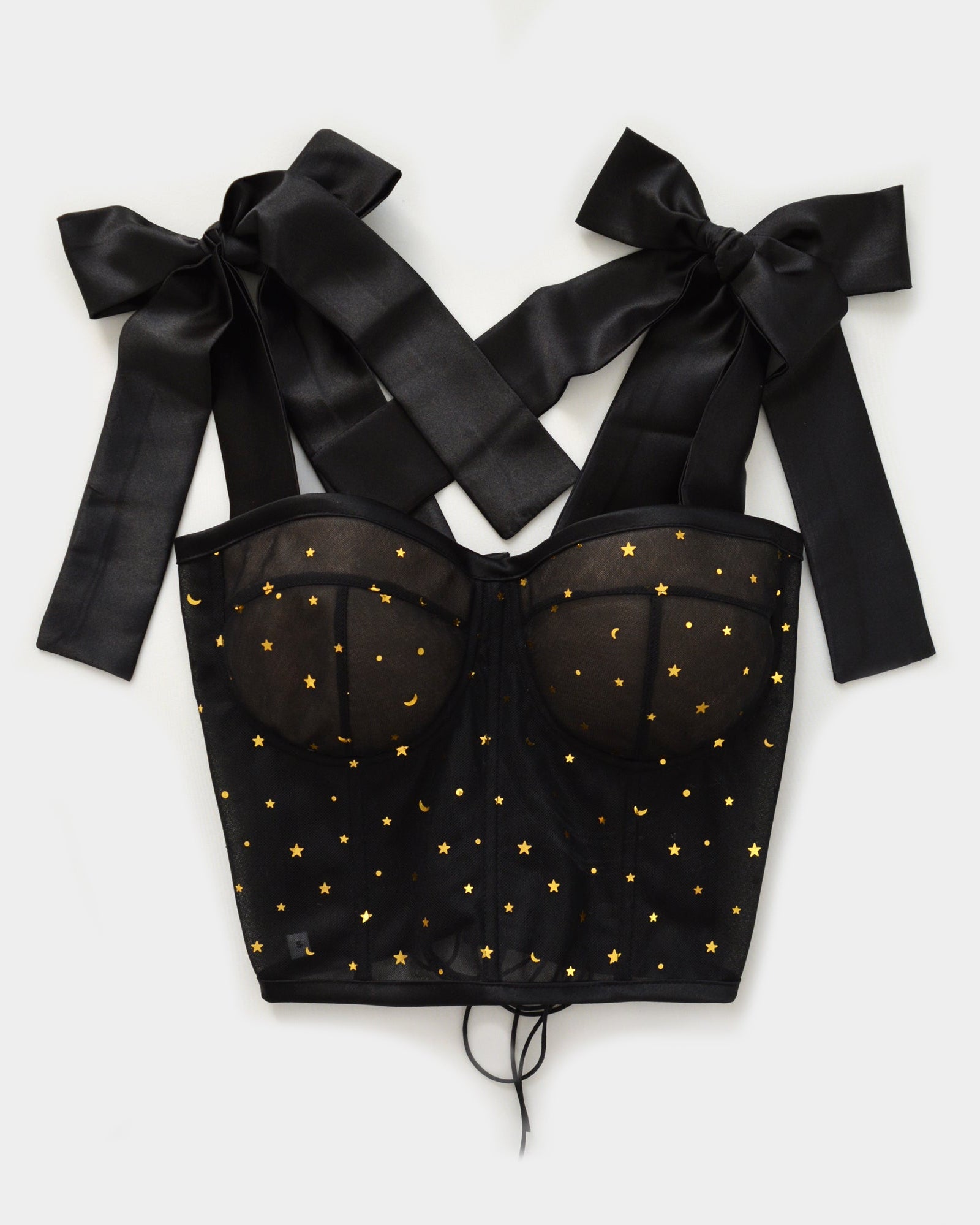 The highlight of this design is its beautifully adjustable straps that tie into graceful bows on the shoulders, adding a touch of charm and femininity. These knotted bows aren’t just a lovely detail—they’re functional too, allowing you to adjust the corset to your perfect fit for added comfort and support.