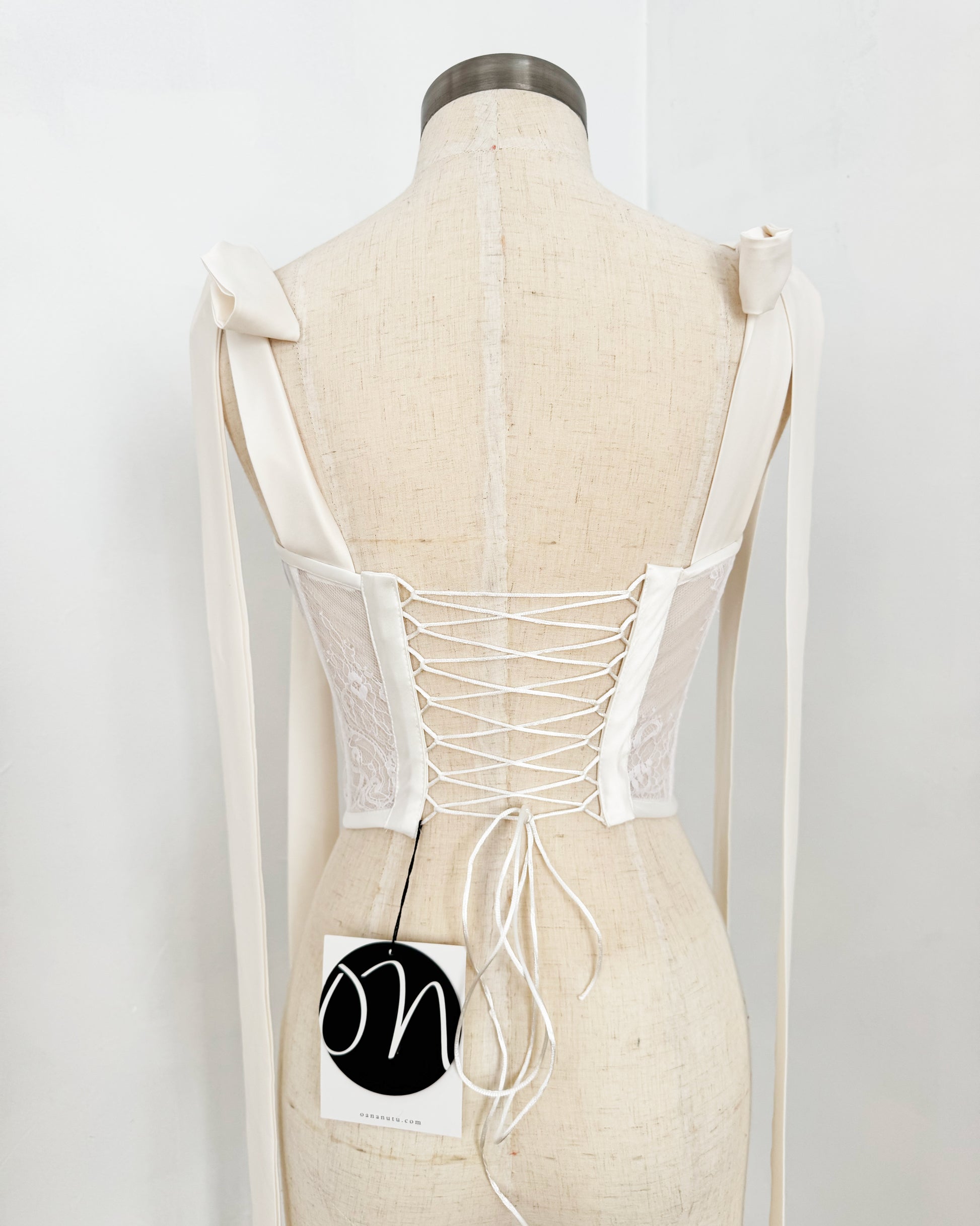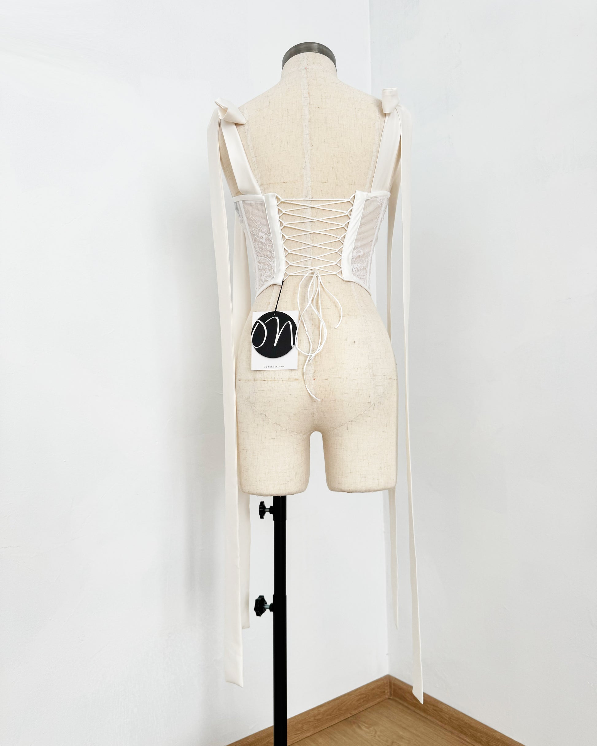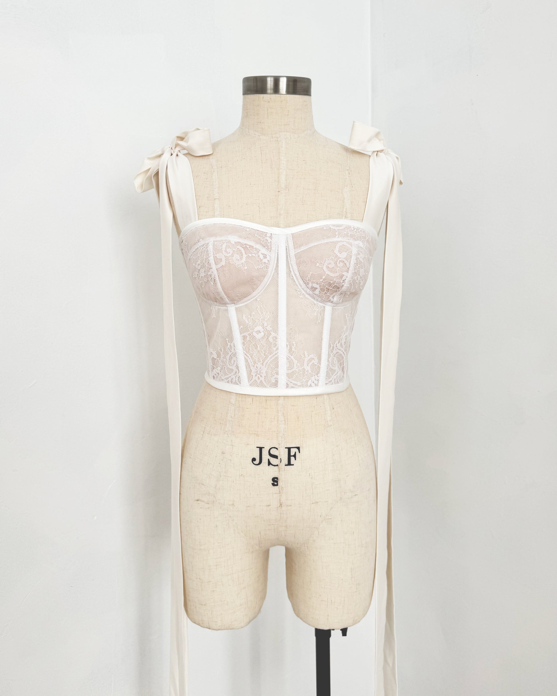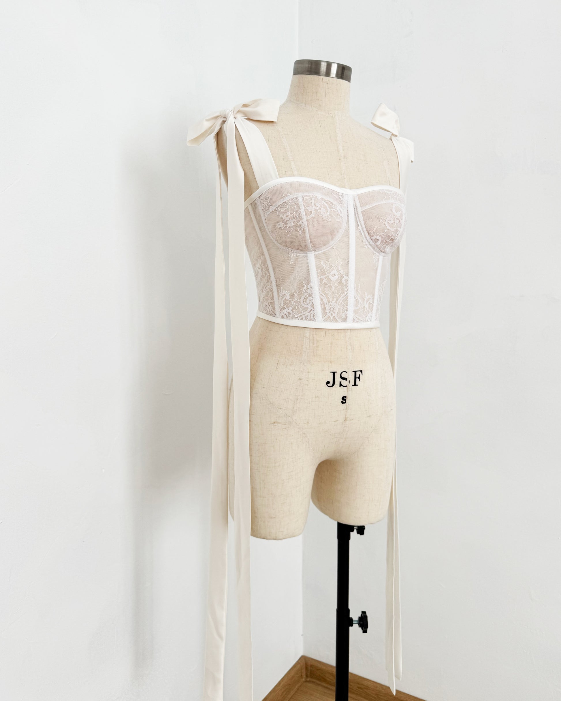Adjustable shoulder straps in an intense red tone are finished with feminine ties, allowing for a customizable fit while reinforcing the romantic aesthetic of the piece.