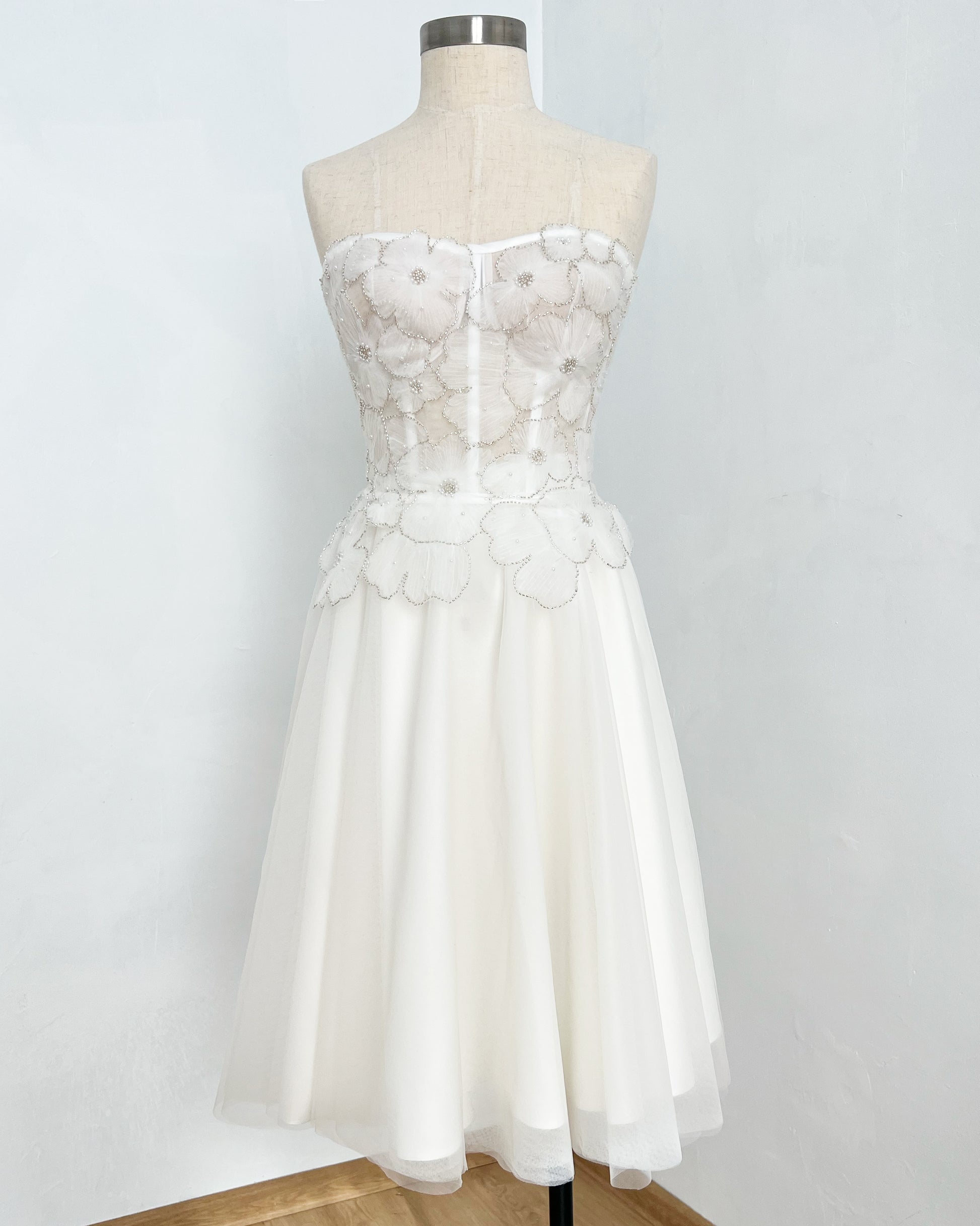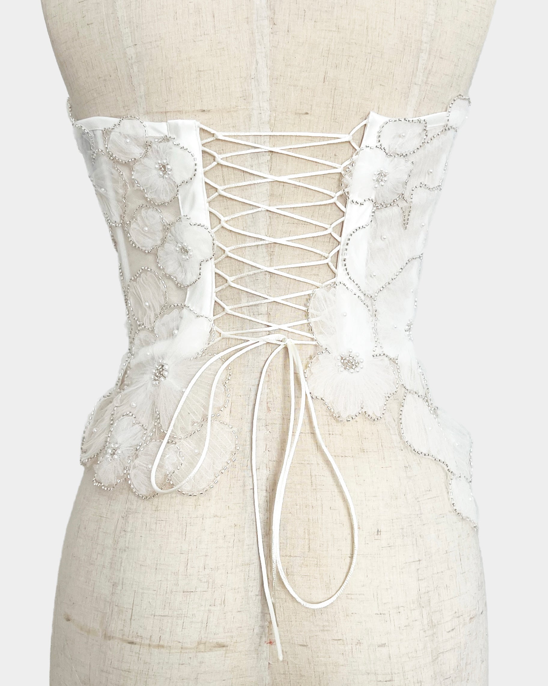 The embroidery is hand-applied and hand-stitched, which means slight variations may occur from one piece to another. These subtle differences are a natural result of the artisanal process and make each corset unique.