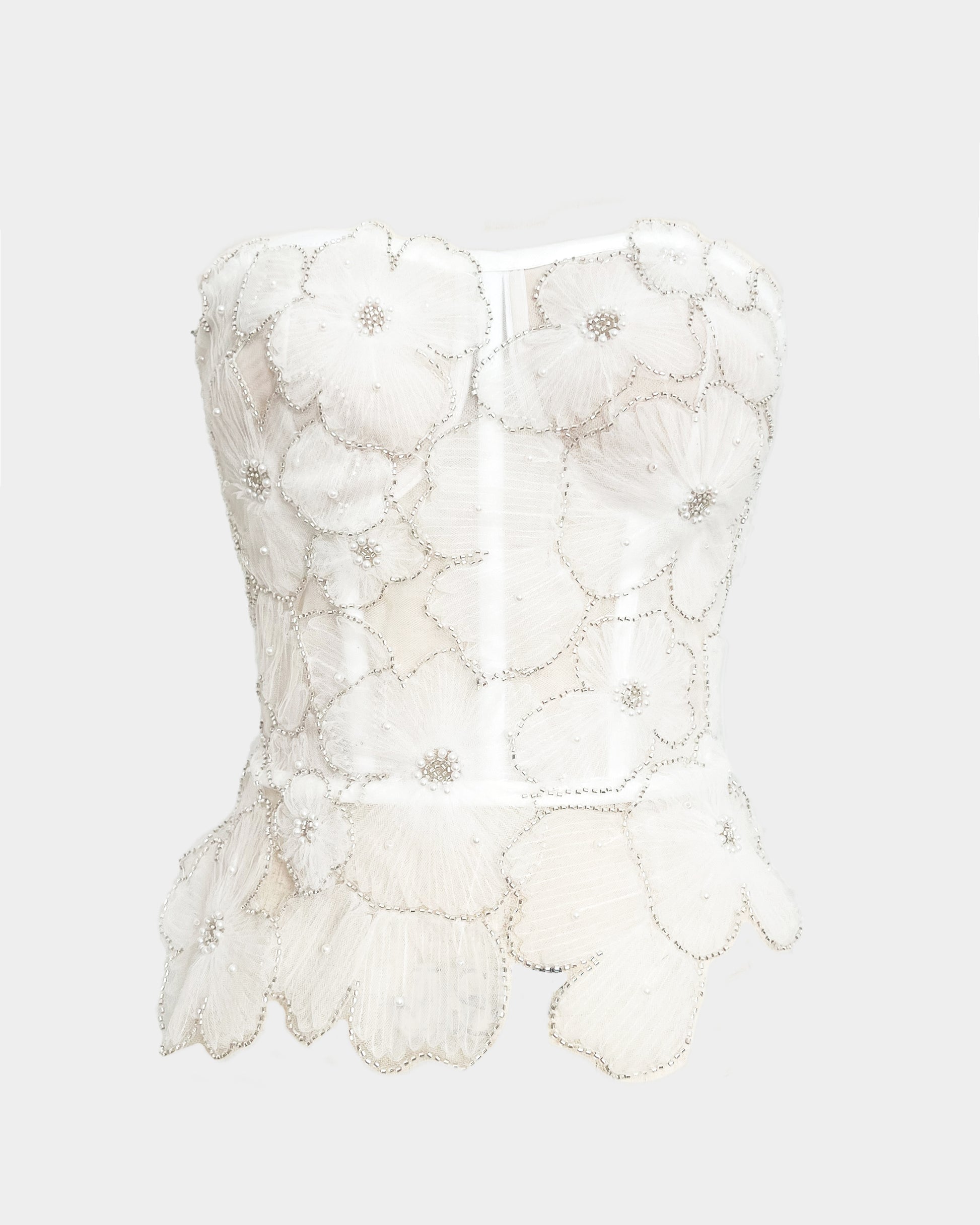 Step into a dream with this stunning white couture corset top, where delicate craftsmanship meets timeless romance. The bodice features an intricate embroidered corsetry top, blending structure and softness effortlessly.