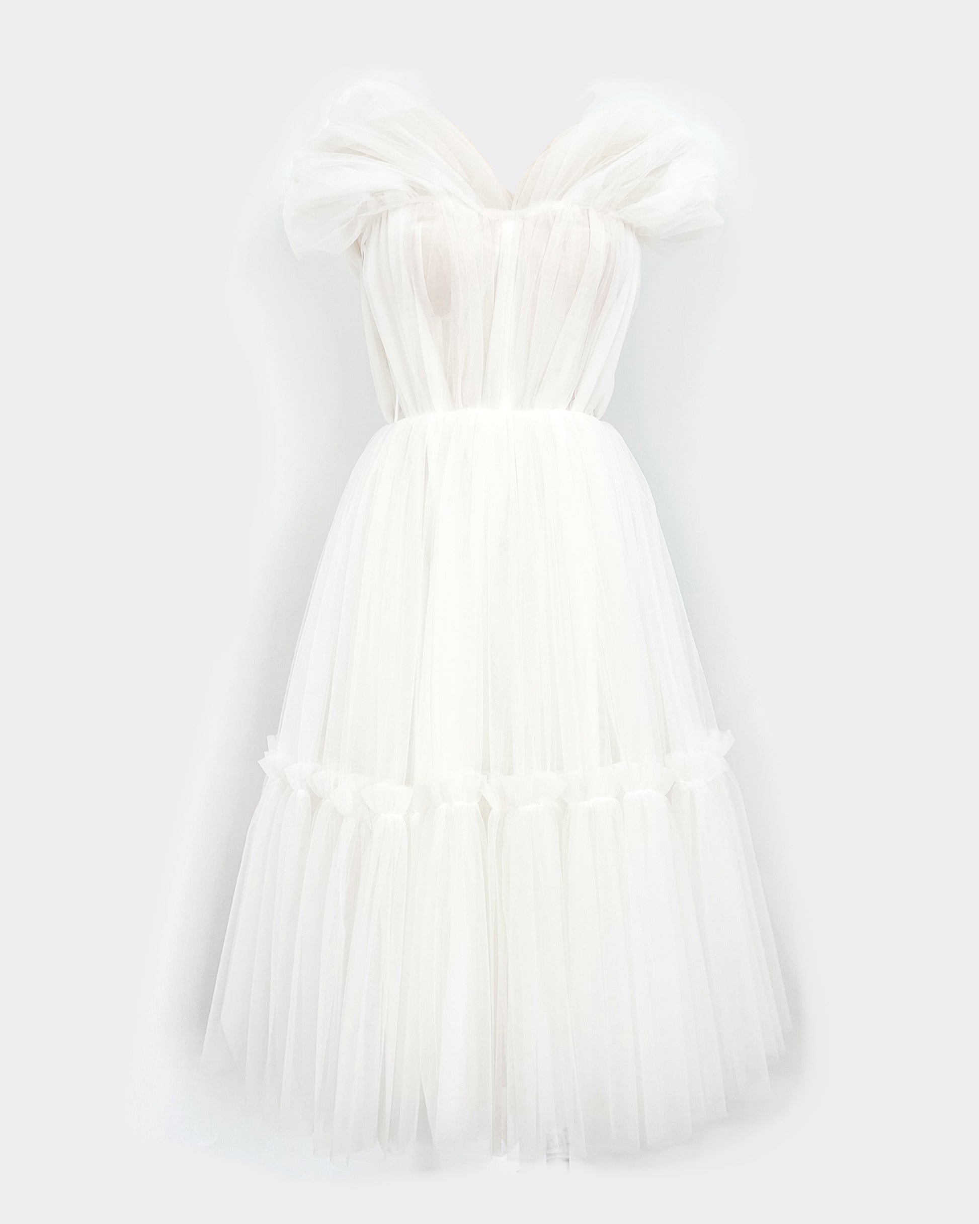 The sculpted corset bodice hugs your silhouette, while the off-the-shoulder sleeves and sweetheart neckline add a romantic, effortlessly chic touch.