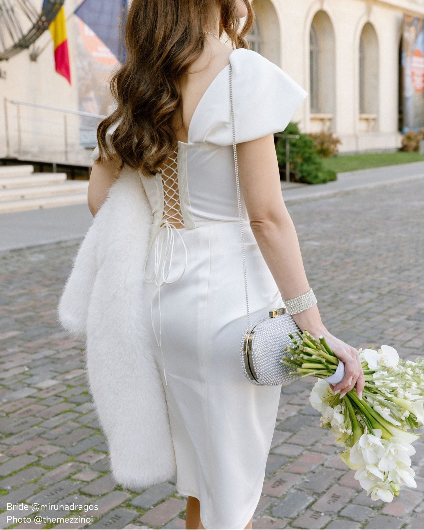 Elegant draped white knee-length skirt with lining.