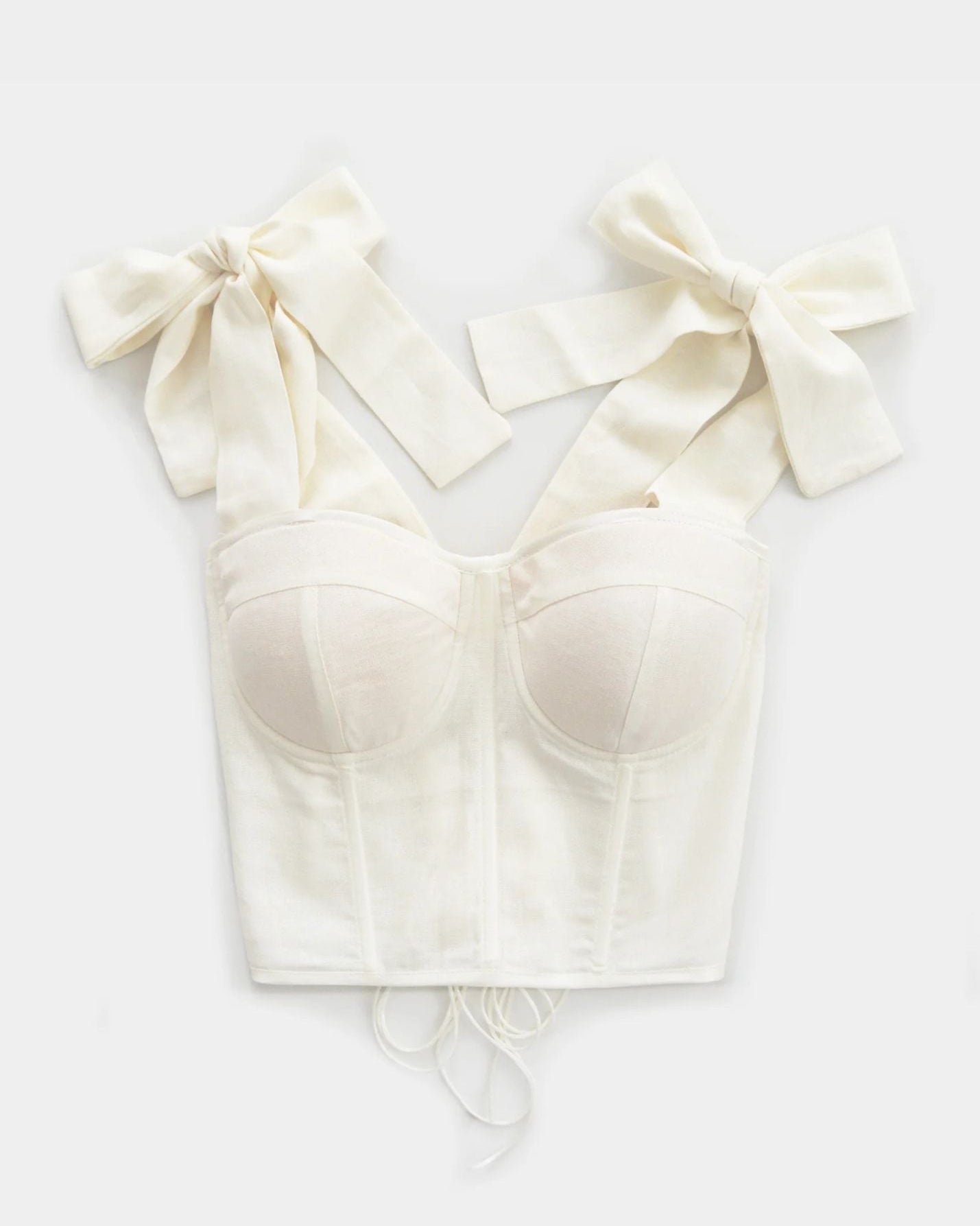 Soft, breathable linen meets timeless femininity in this handcrafted ivory corset. Designed for both comfort and structure, it features delicate shoulder straps that tie into charming bows, offering an adjustable fit and subtle push-up effect.