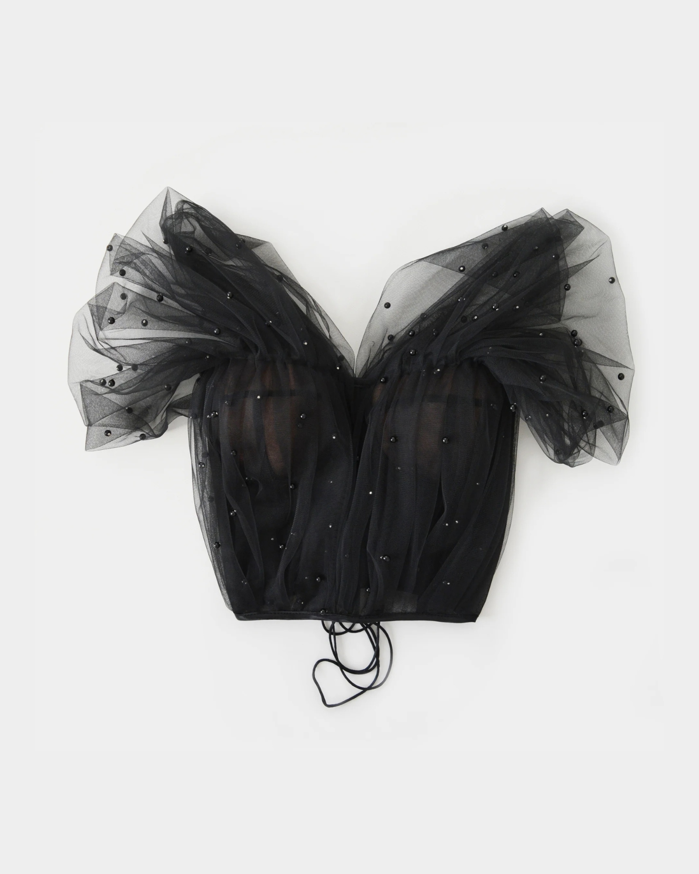 Indulge in timeless elegance with the PEARLS ARE A GIRL'S BEST FRIEND BLACK CORSET a statement piece designed to enchant. This structured corset features expertly placed boning for a sculpted silhouette, while built-in foam cups provide both support and comfort. The delicate mesh tulle is meticulously draped by hand, creating an ethereal, cloud-like effect that flatters every curve. Scattered with luminous pearls, this piece shimmers subtly, making it perfect for any occasion—from romantic evenings to bold fashion statements. With its adjustable lace-up back, the product ensures a custom fit, combining luxury with effortless wearability.