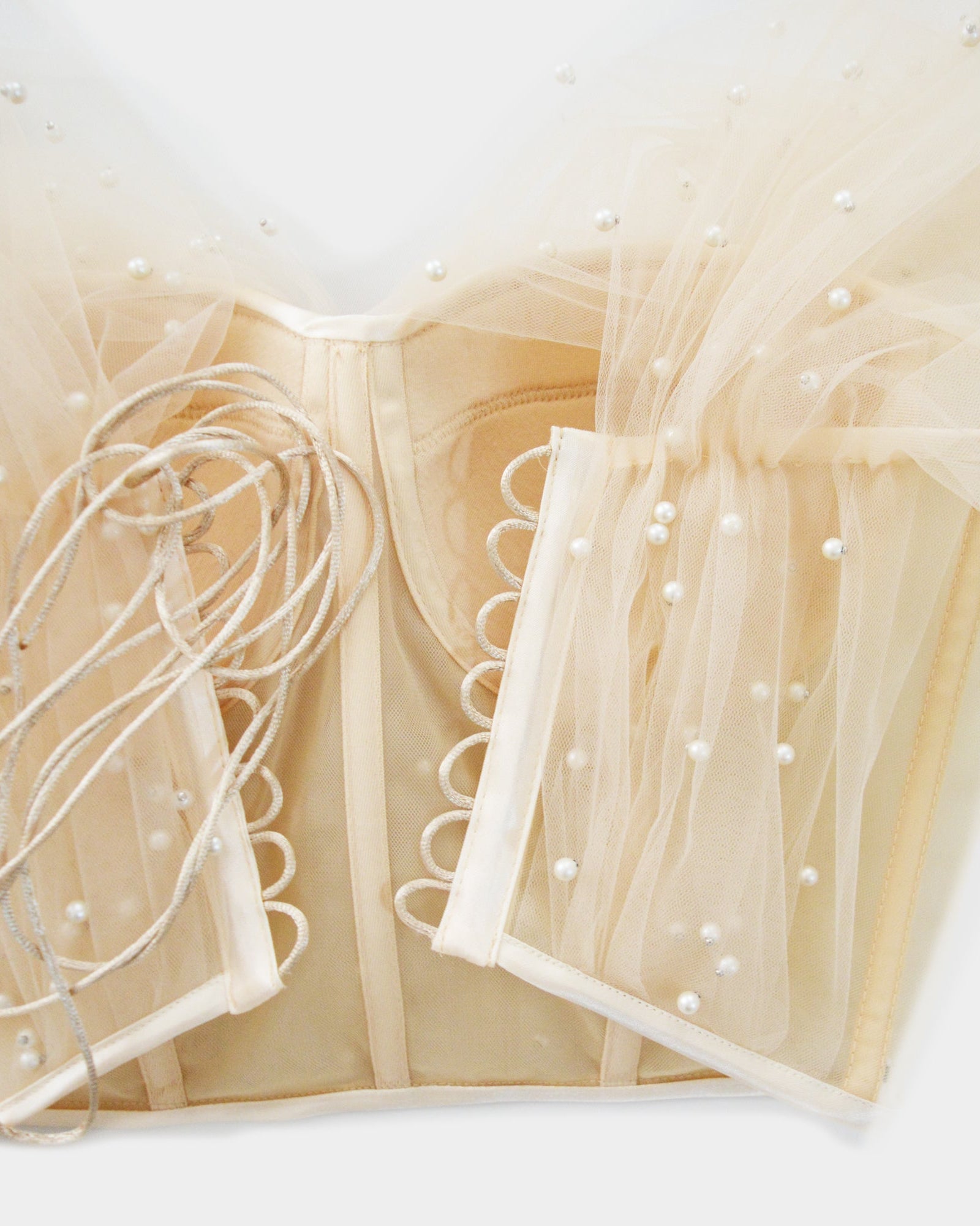 Indulge in timeless elegance with the PEARLS ARE A GIRL'S BEST FRIEND CREAM CORSET a statement piece designed to enchant. This structured corset features expertly placed boning for a sculpted silhouette, while built-in foam cups provide both support and comfort. The delicate mesh tulle is meticulously draped by hand, creating an ethereal, cloud-like effect that flatters every curve. Scattered with luminous pearls, this piece shimmers subtly, making it perfect for any occasion—from romantic evenings to bold fashion statements. With its adjustable lace-up back, the product ensures a custom fit, combining luxury with effortless wearability.