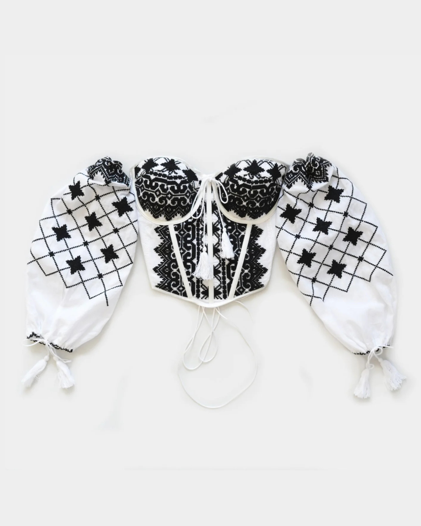 A masterpiece of tradition and innovation, this corset is the first in the world to transform the iconic Romanian blouse into a modern silhouette. Handcrafted with care, it preserves the delicate embroidery and cultural essence of ie, reinterpreted for the bold, contemporary woman.