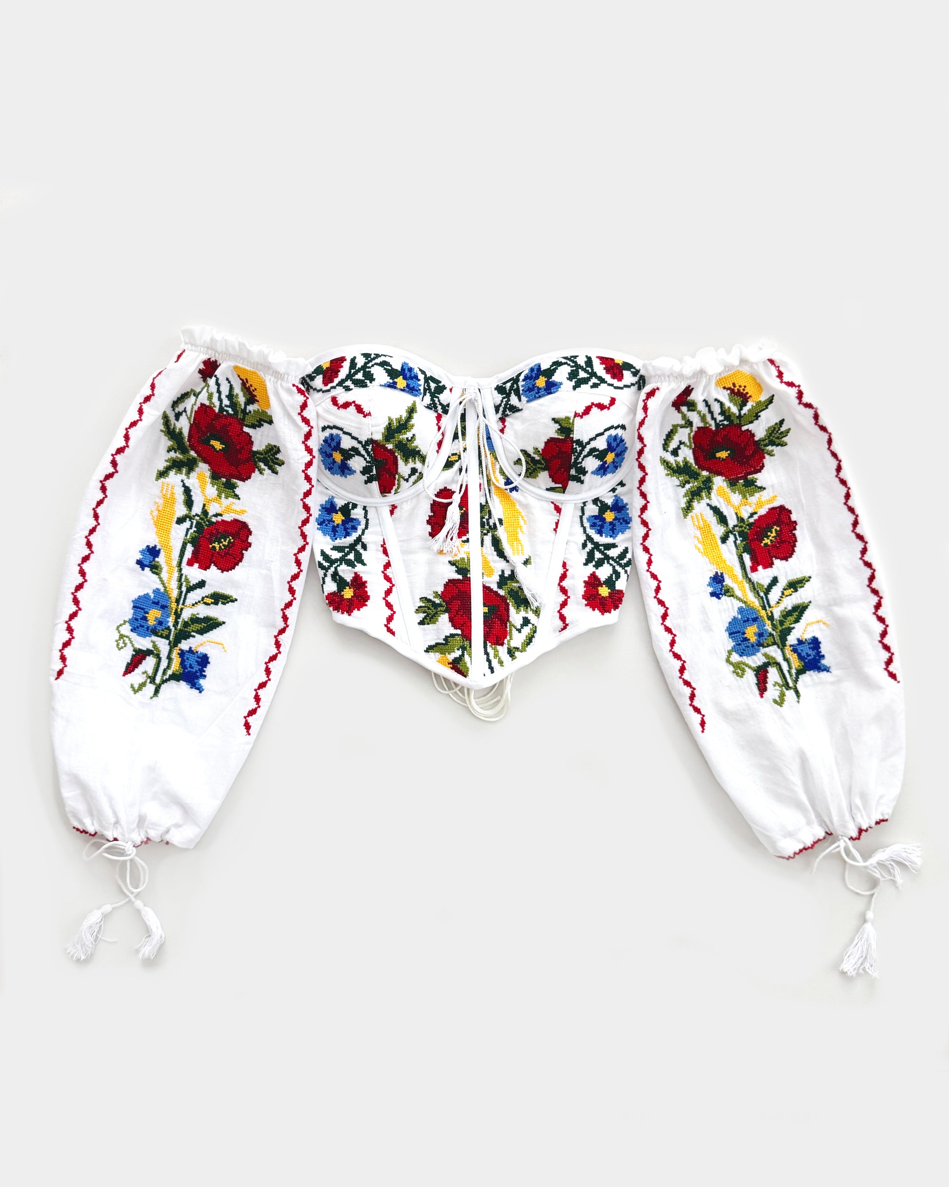 A masterpiece of tradition and innovation, this corset is the first in the world to transform the iconic Romanian blouse into a modern silhouette. Handcrafted with care, it preserves the delicate embroidery and cultural essence of ie, reinterpreted for the bold, contemporary woman.