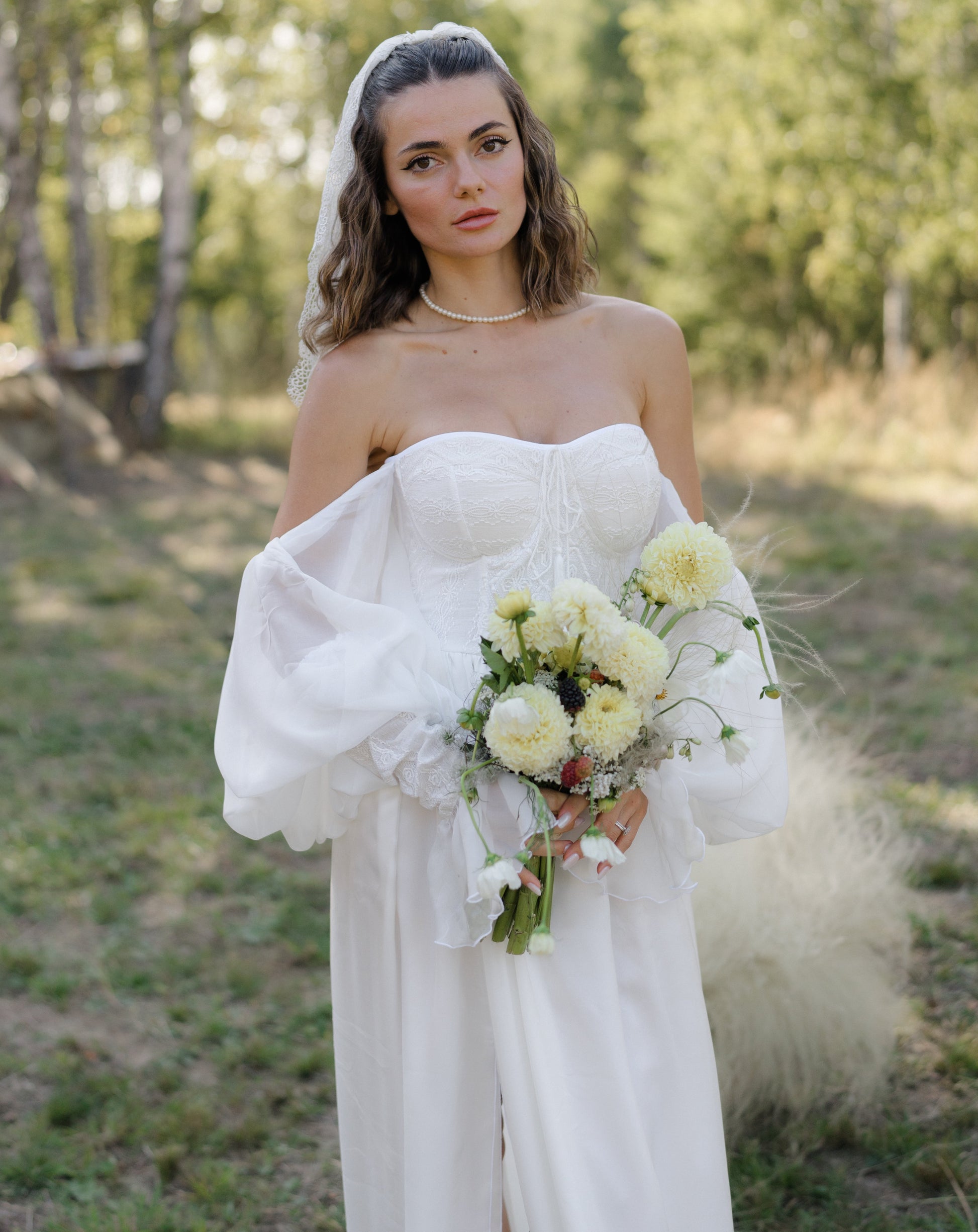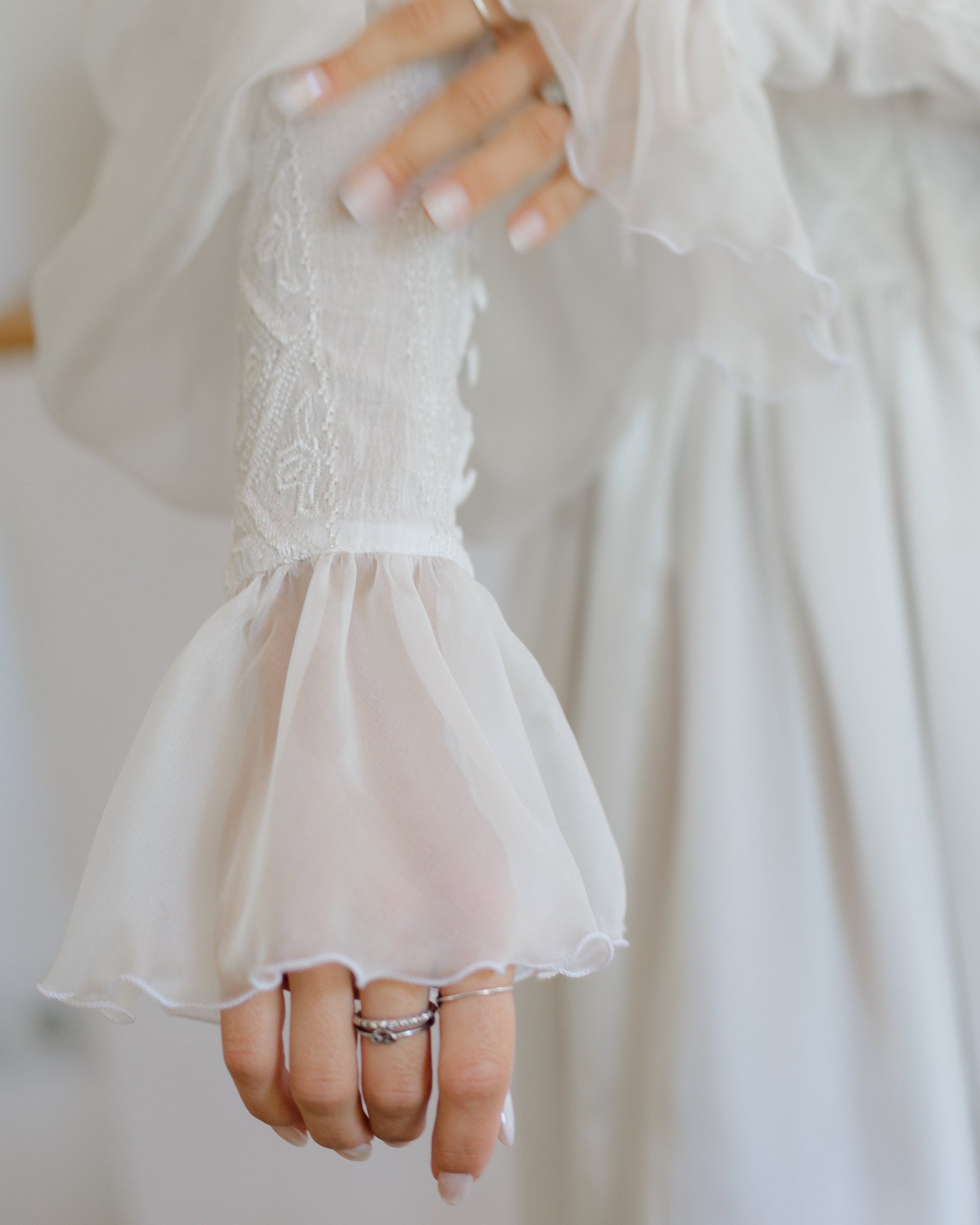 The sleeves feature traditional embroidered accents and soft natural silk ruffles that bring fluidity and movement. The contrast between the structured corset and the airy volume of the ruffles creates a sophisticated balance between strength and romance.