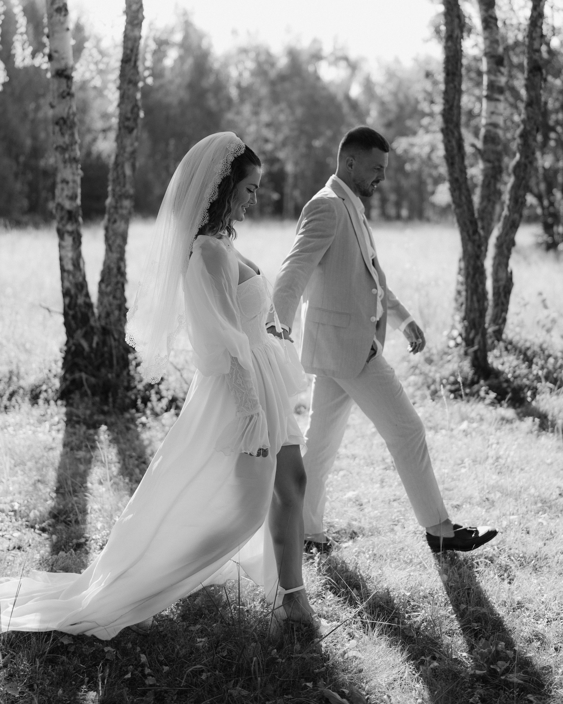 The skirt flows generously in luminous, heavy-falling natural silk, featuring a leg slit that subtly reveals and adds a modern, confident touch. The train completes the composition, adding drama and presence for a truly memorable bridal entrance.