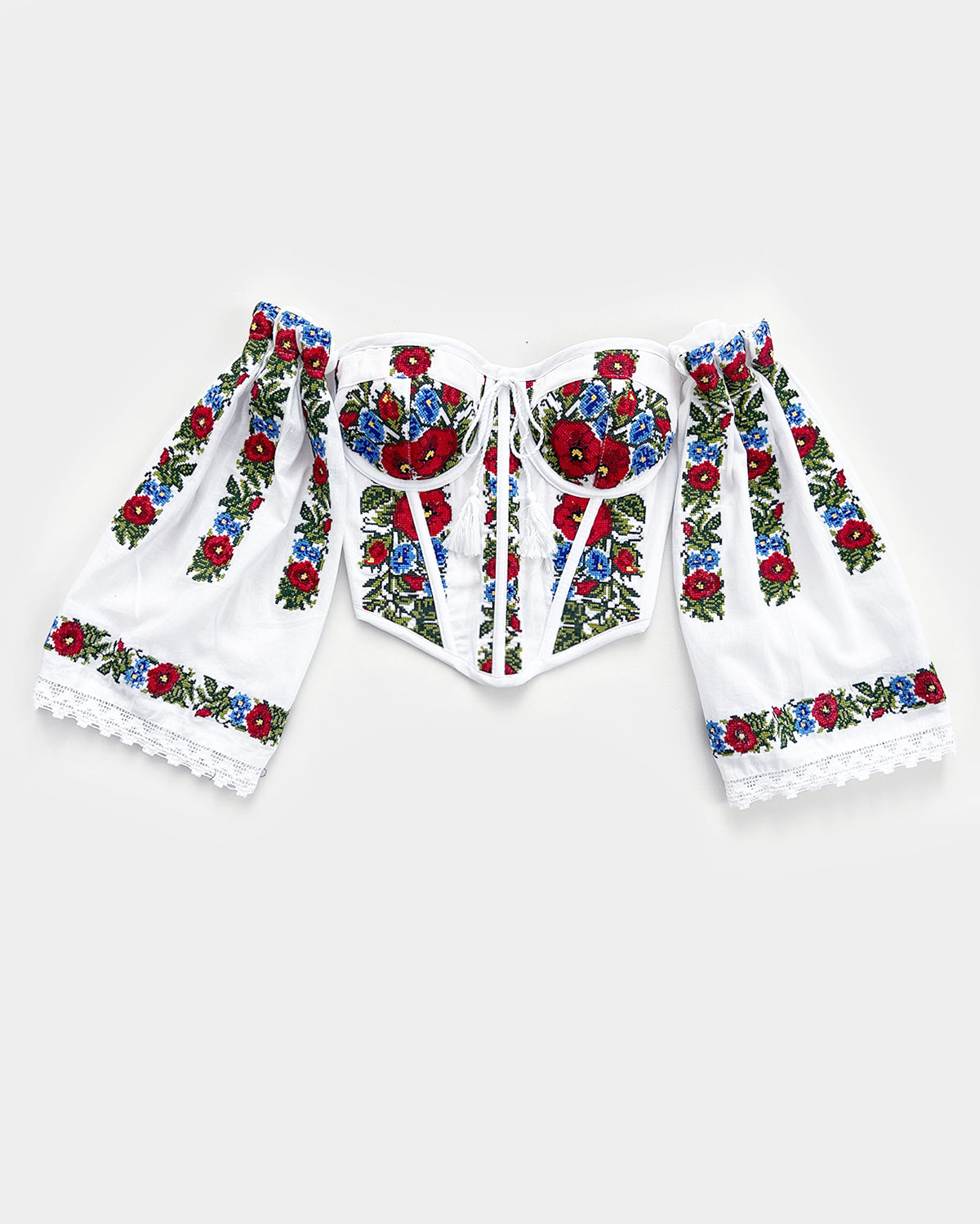A masterpiece of tradition and innovation, this corset is the first in the world to transform the iconic Romanian blouse into a modern silhouette. Handcrafted with care, it preserves the delicate embroidery and cultural essence of ie, reinterpreted for the bold, contemporary woman.