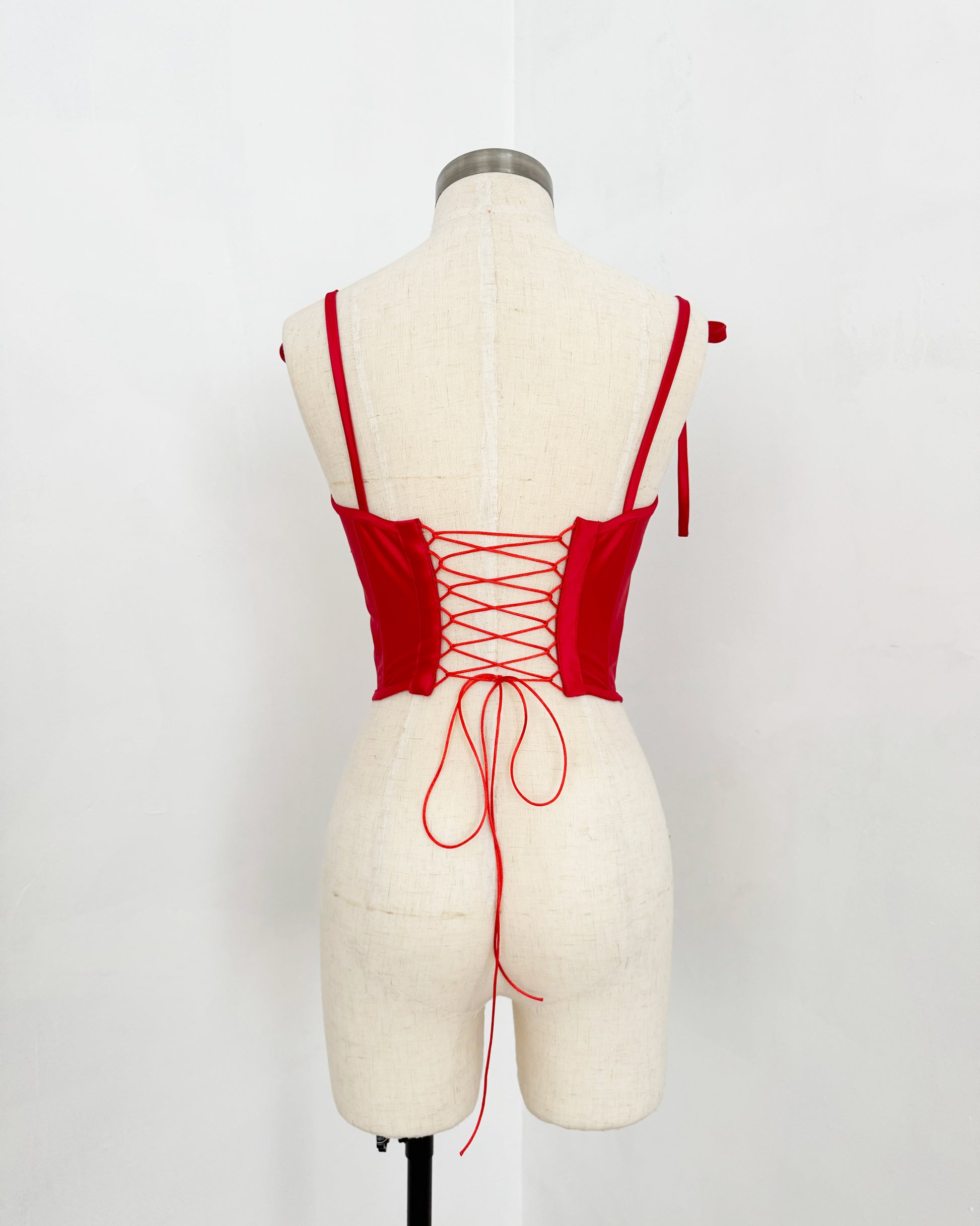 Created exclusively for Valentine’s Day, this limited-edition corset is a celebration of romance and femininity. Crafted in a rich red satin, it features delicate shoulder ties and sculpted cups designed to flatter and support the silhouette.