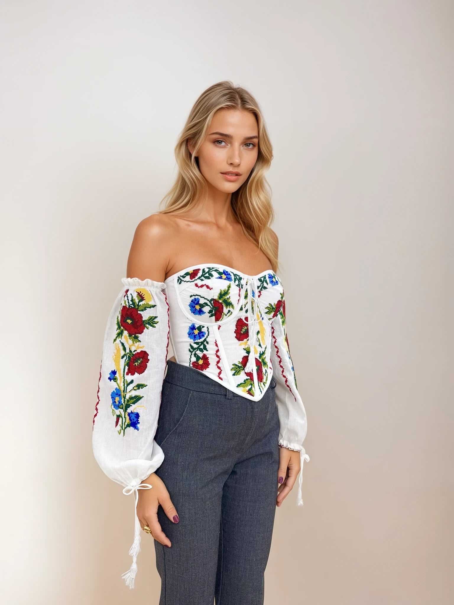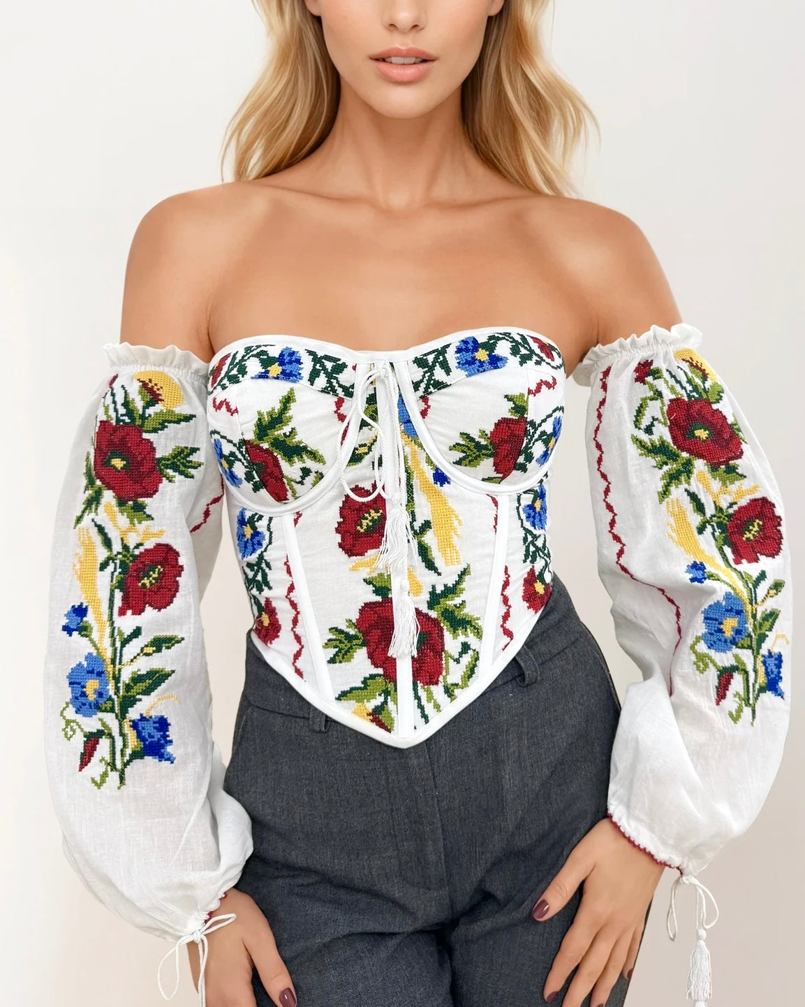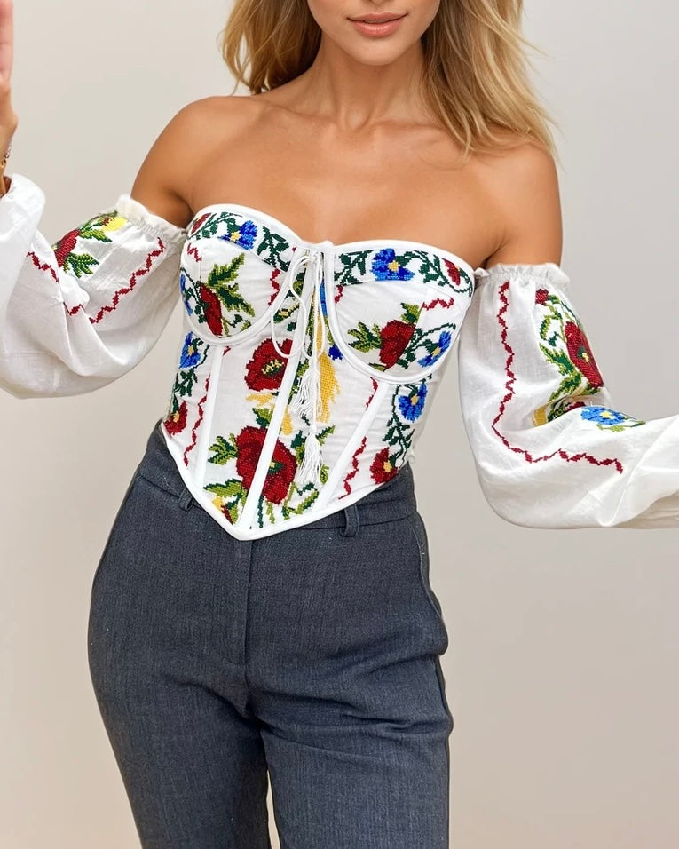 A masterpiece of tradition and innovation, this corset is the first in the world to transform the iconic Romanian blouse into a modern silhouette. Handcrafted with care, it preserves the delicate embroidery and cultural essence of ie, reinterpreted for the bold, contemporary woman.